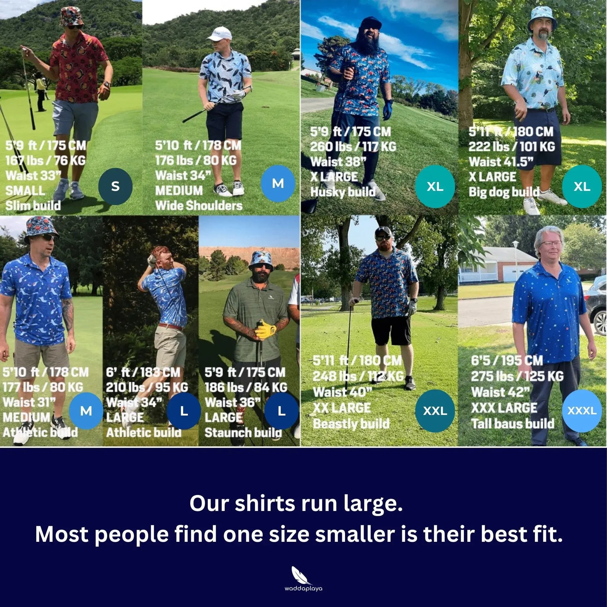 The shirts are magnificent. The feel of the cloth is amazing and the sizes are just perfect. A must have for any Waddaplayer. With these shirts the game will be even more exciting. Thank you Matt. Size M is perfect for slim built up to 185 cm length. Size L ist perfect for athletic built up to 190 cm length.