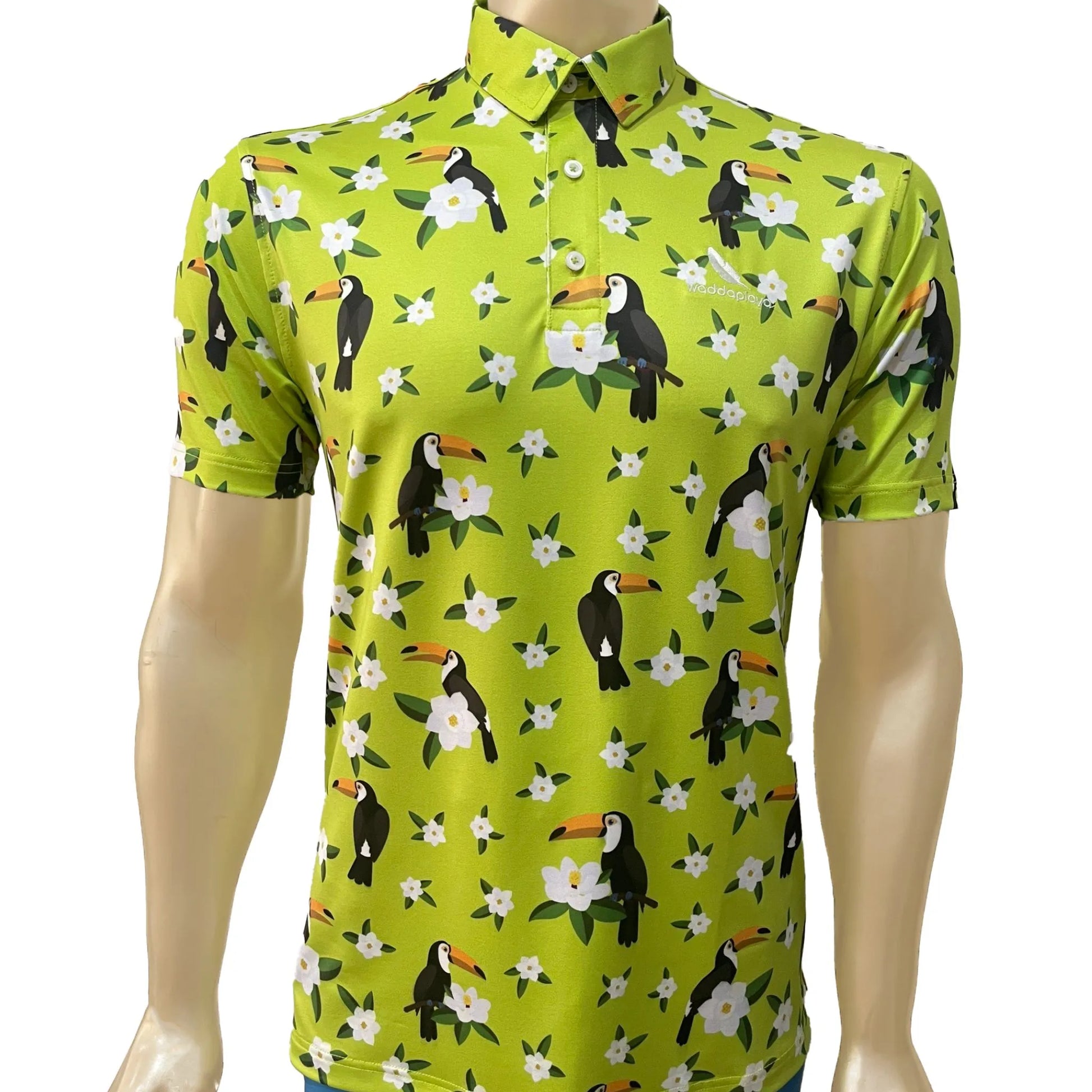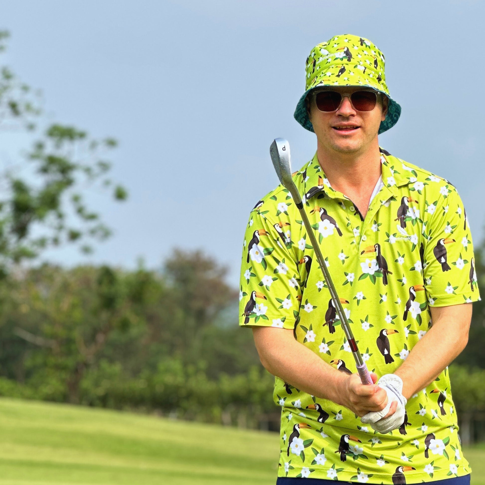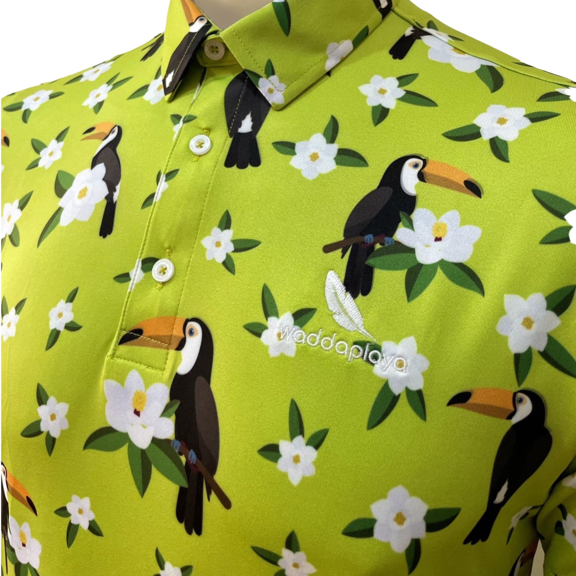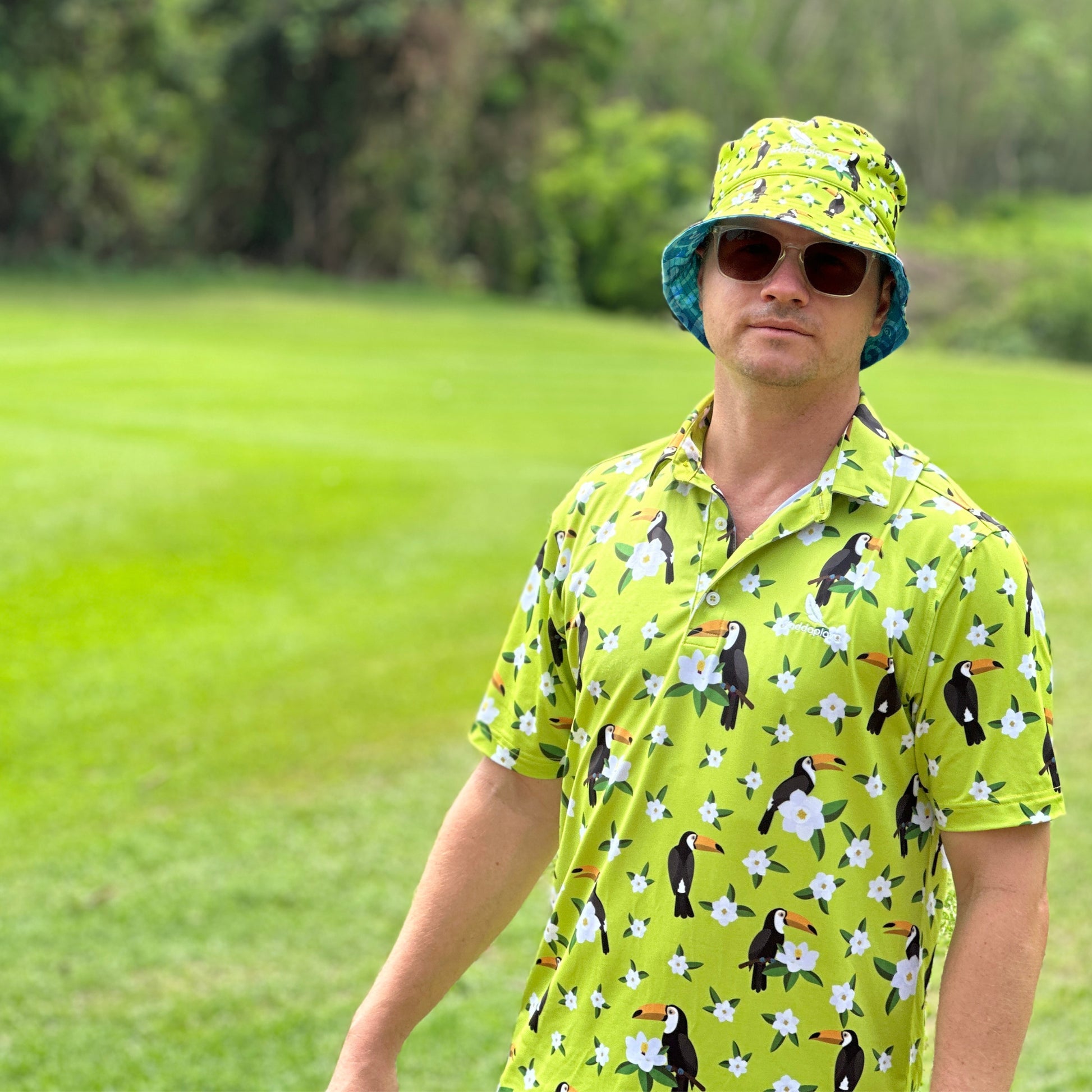 A treasure trove of visual delight, this green polo is adorned with playful toucan birds and delicate white flowers, setting the tone for a round of golf that's as fun as it is confidential.